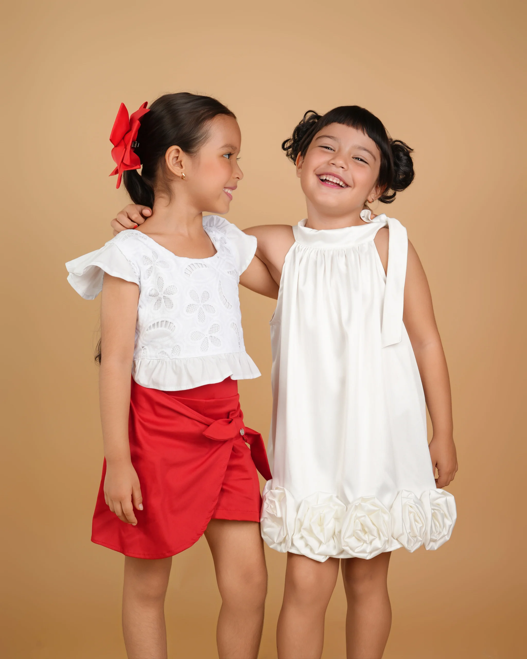 🎄 Elaborado en satín novia estructurado, este vestido deslumbra por su brillo sutil y sofisticado. Su diseño tipo halter con lazo al cuello combina elegancia y dulzura, ideal para eventos especiales. El detalle inferior con flores 3D añade un acabado artesanal que realza su encanto, convirtiéndolo en una prenda perfecta para galas o celebraciones navideñas. ✨