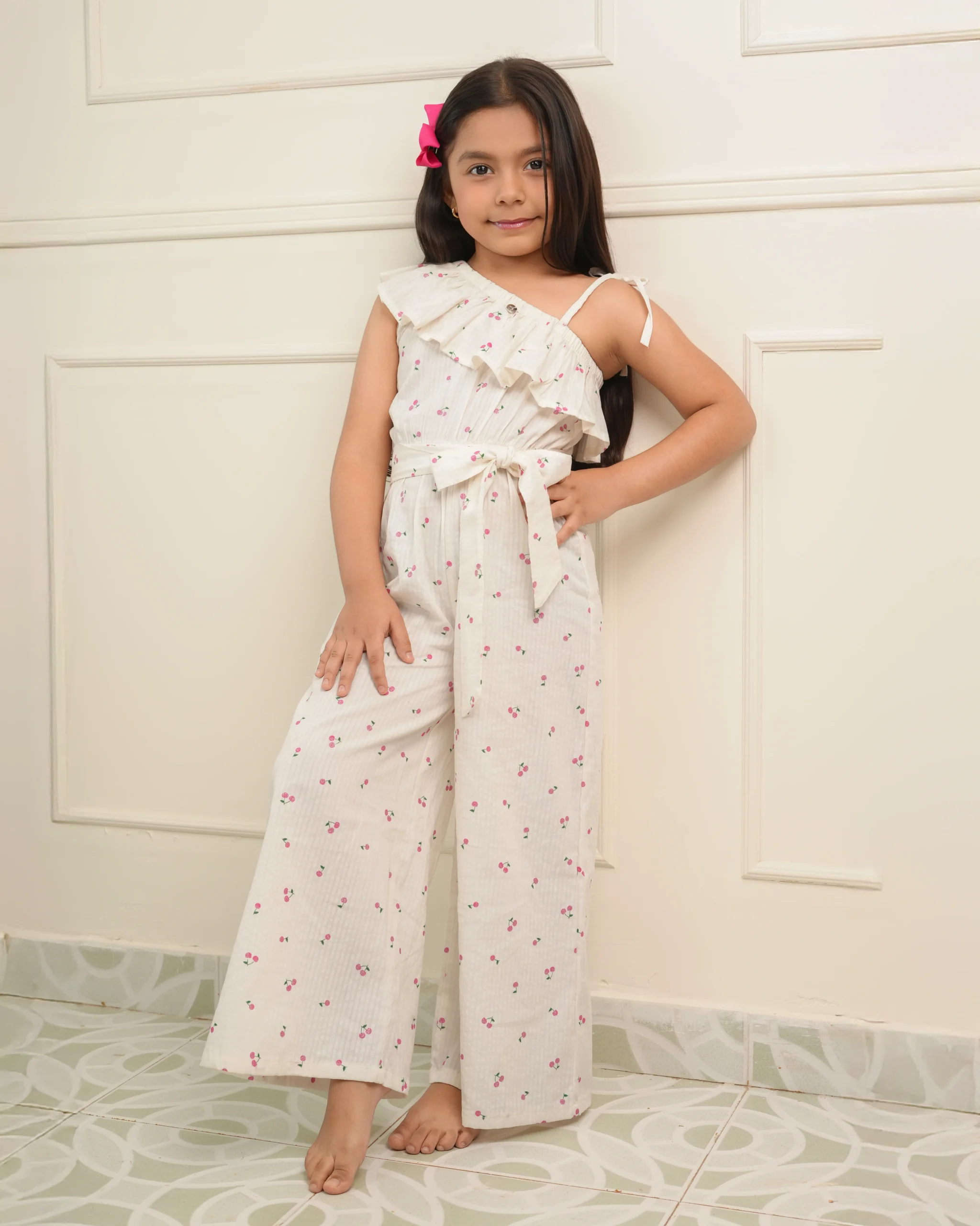 Enterizo Cereza:Su diseño de un hombro con volantes, estampado delicado y lazo en la cintura lo hacen fresco, cómodo y lleno de encanto.