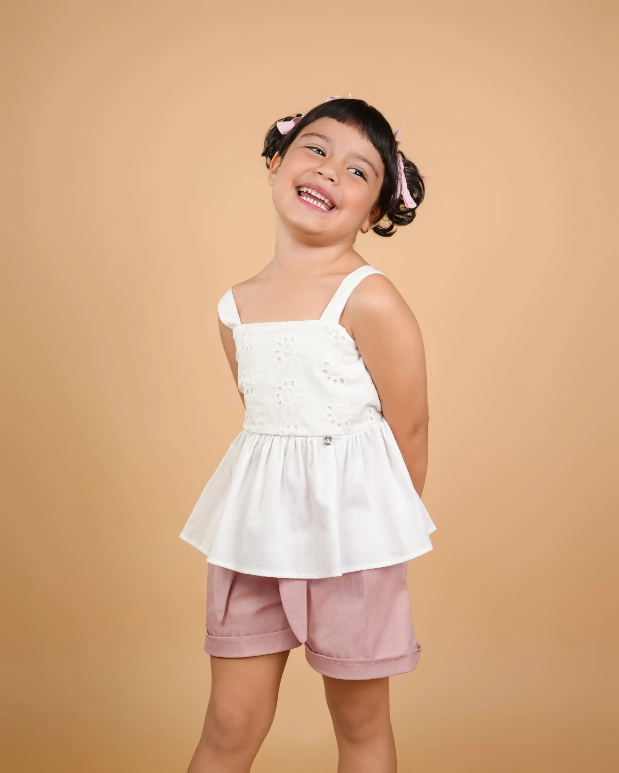 Perfecto para los días festivos, combinando frescura, comodidad y un toque de dulzura. Su blusa blanca con tirantes y delicado bordado floral resalta la suavidad de la temporada, mientras que el diseño con peplum aporta un estilo juguetón y encantador. El short rosa claro complementa la prenda con un aire relajado y moderno, ideal para el calor. Con su corte cómodo y detalles adorables, este set es perfecto para momentos especiales en familia o celebraciones navideñas.