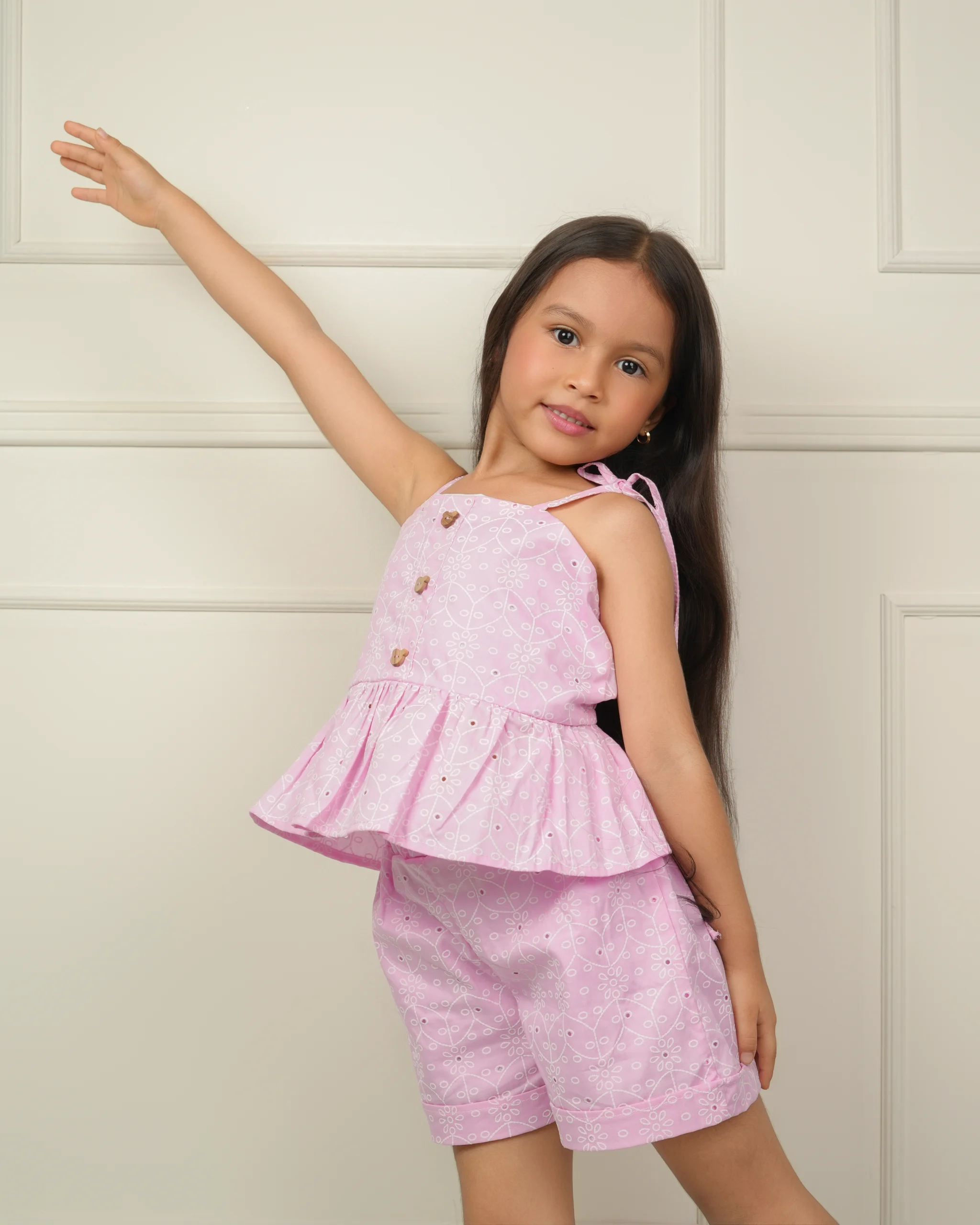 Set Fresco y luminoso, con delicado bordado, tiras ajustables y short cómodo. Un conjunto perfecto para días cálidos y llenos de juego.