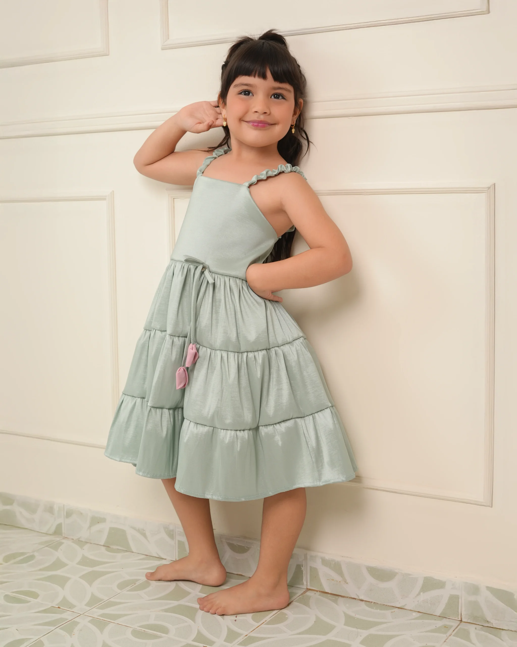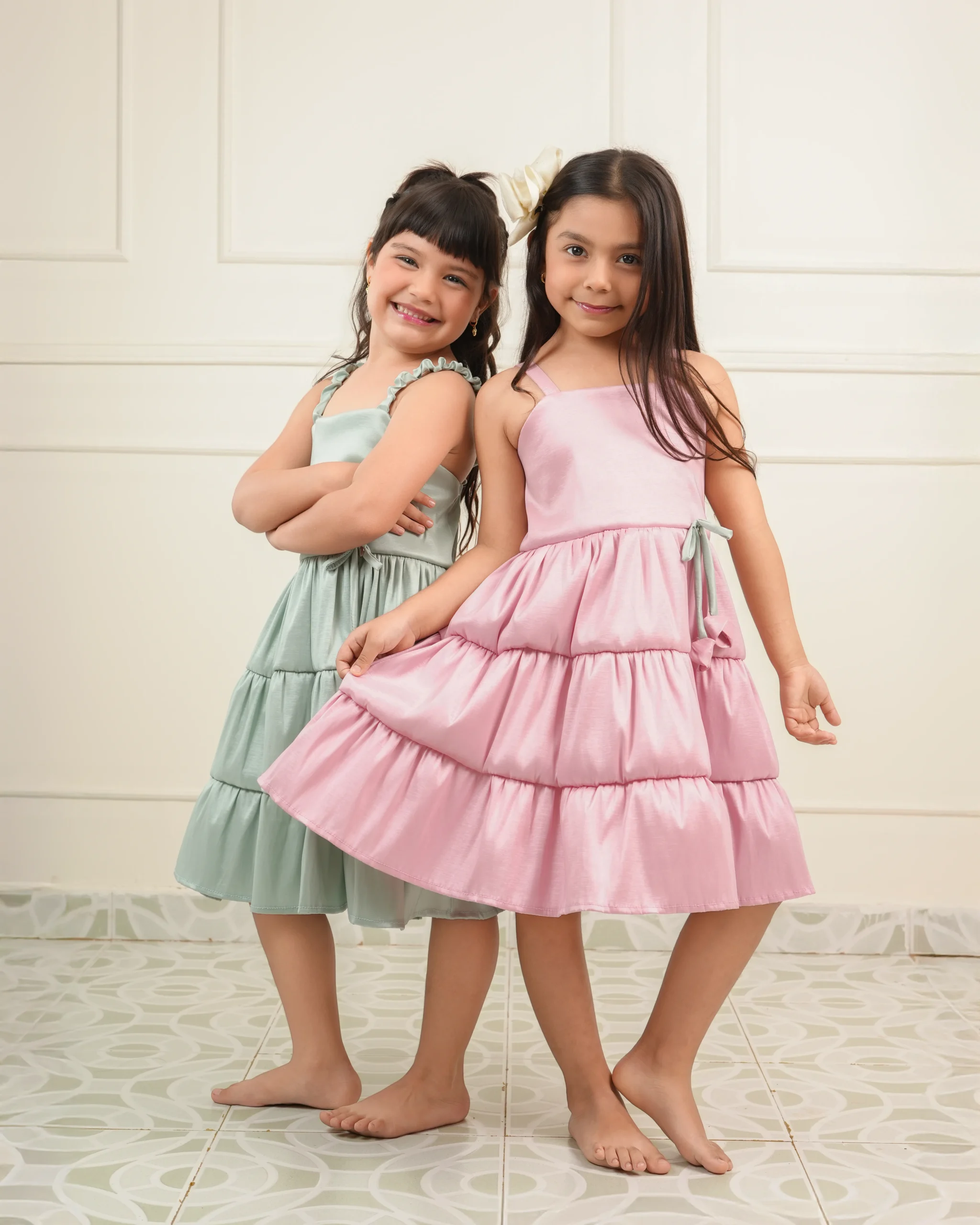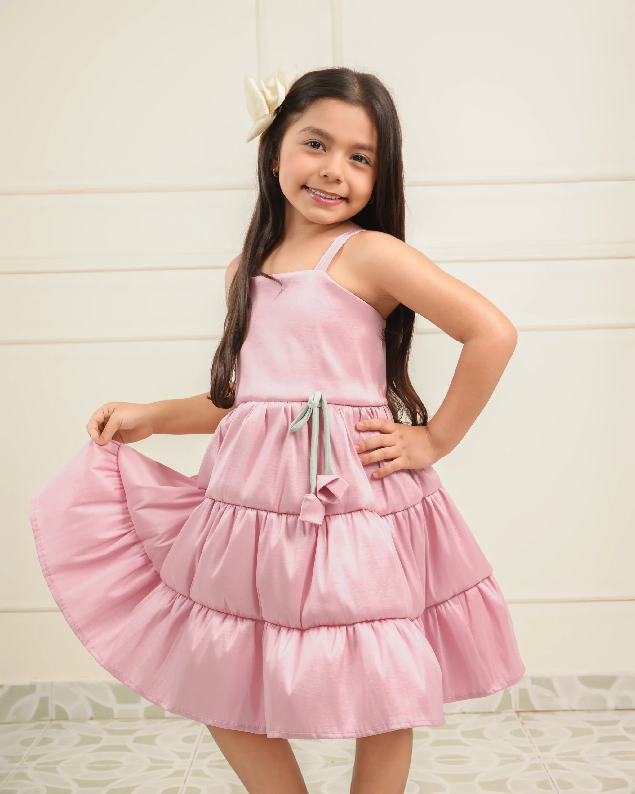 Fresco y ligero, con tiras delgadas y falda de volantes. Su lazo frontal le da el toque romántico perfecto para cualquier ocasión.